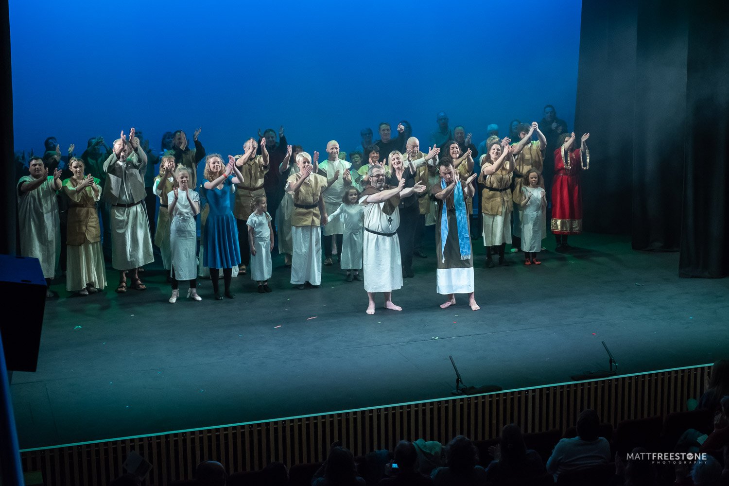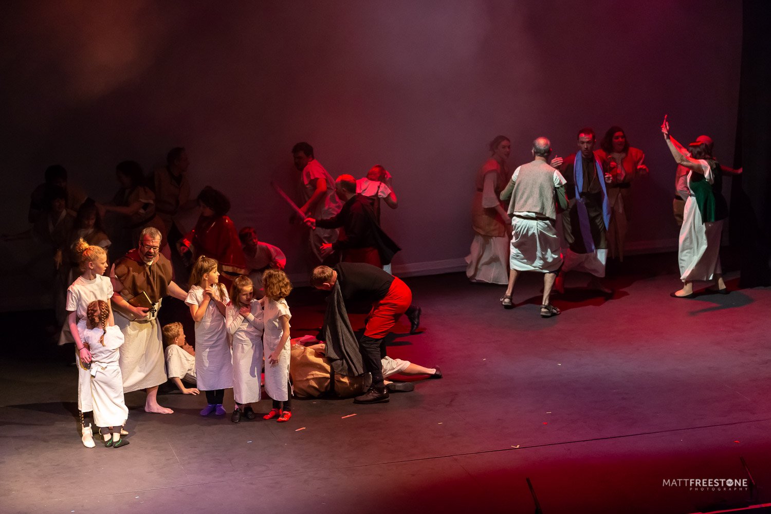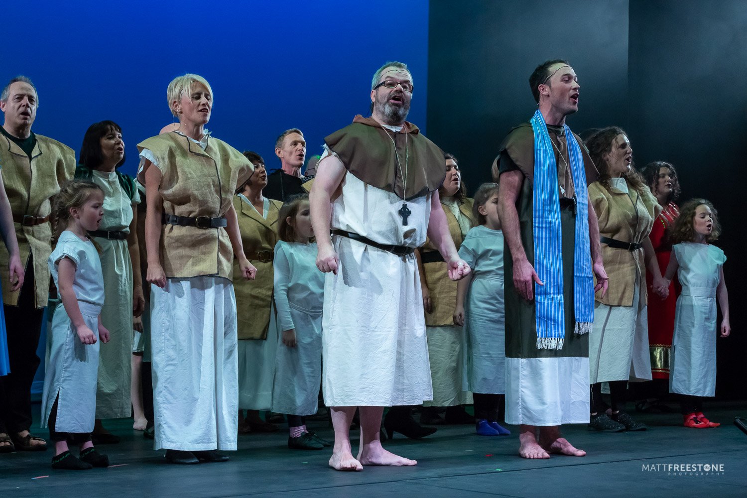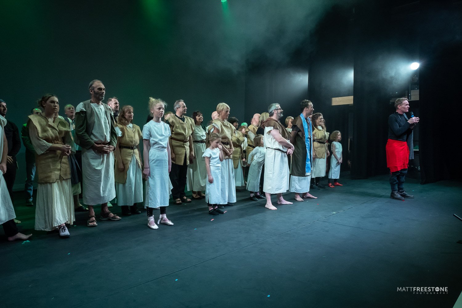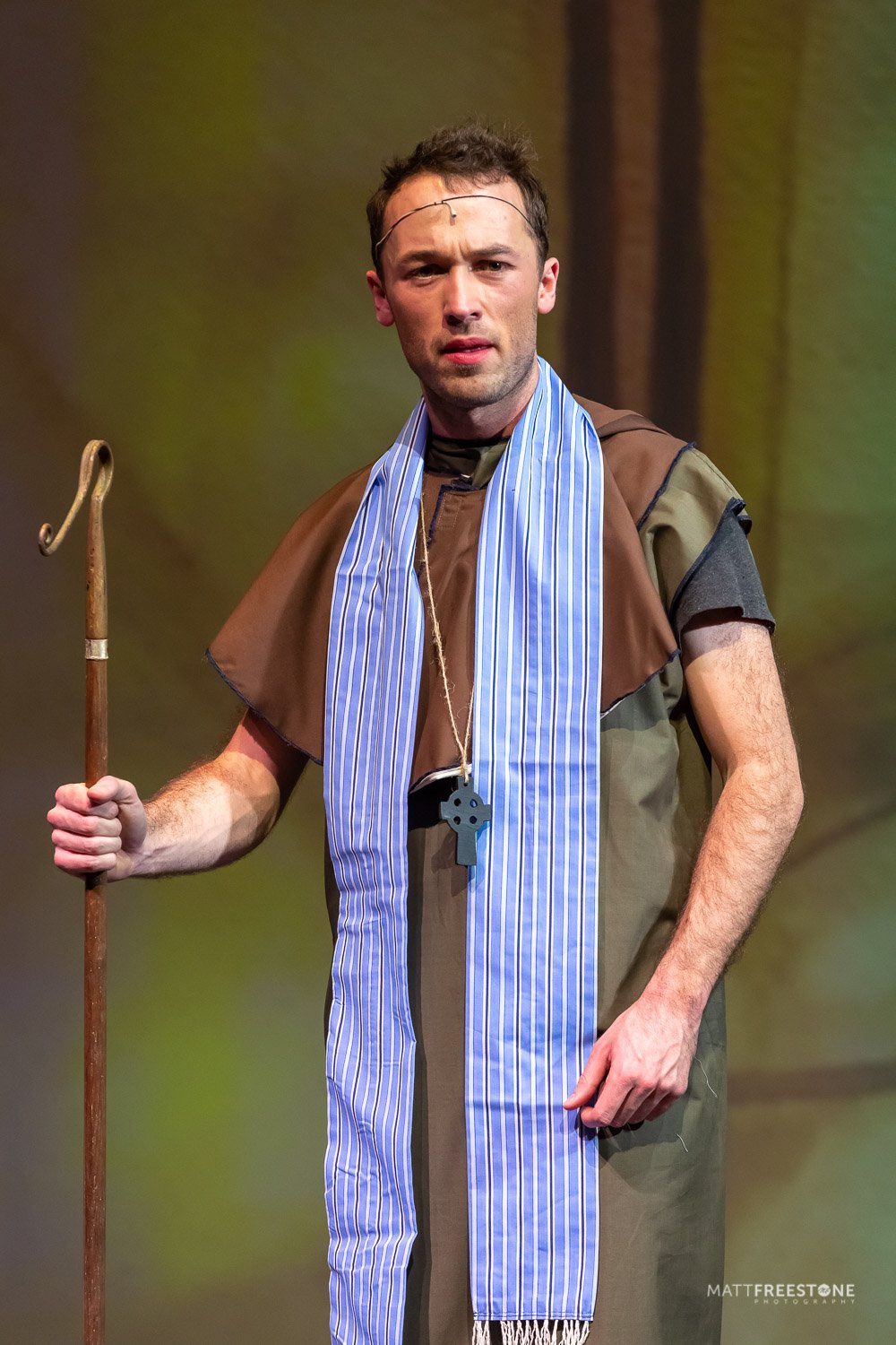 After the Musical opens in the present day with St Patrick’s Day revellers enjoying themselves near a Parade on 17th March, we are then transported back to the 4th/ 5th Century into a British Roman-style community where Patrick grew up with his parents, Calpernius and Conchessa. The story then unfolds using a series of flashbacks described by both narrators and by old Patrick who tells young people about his life: