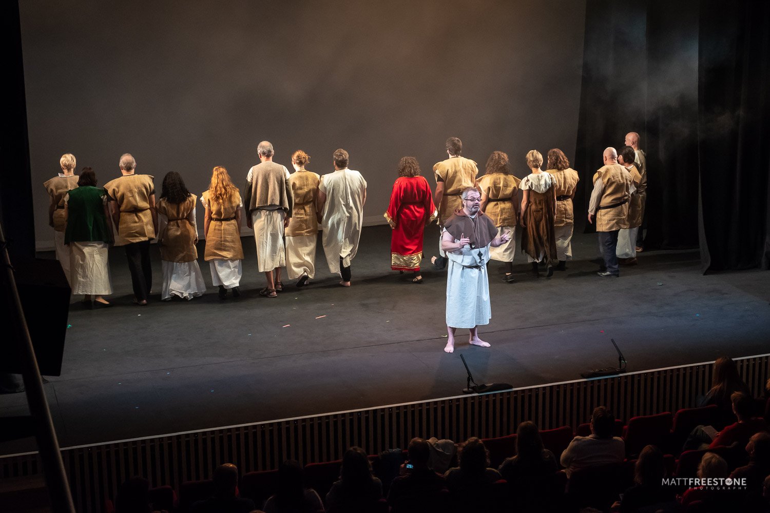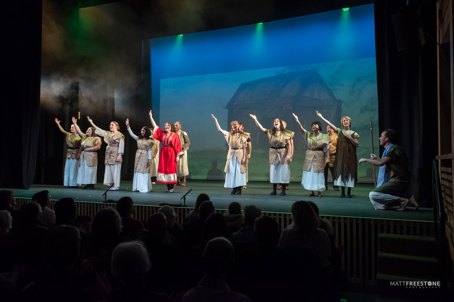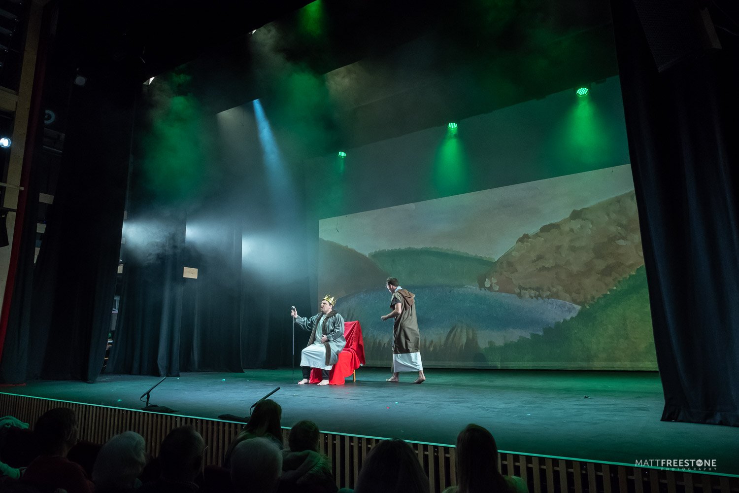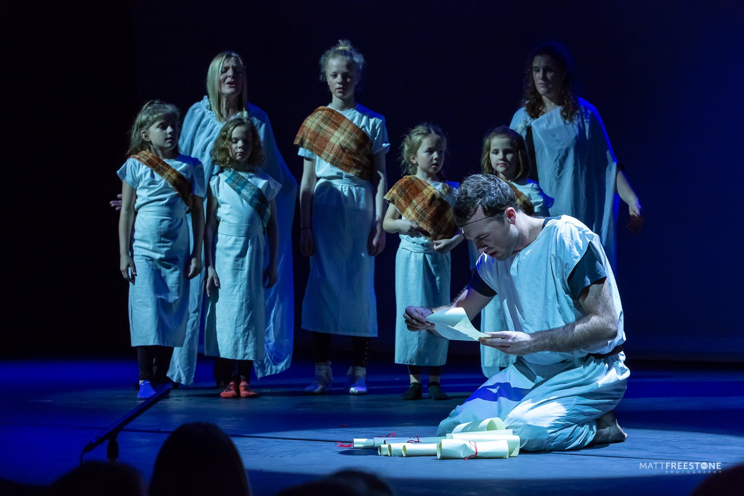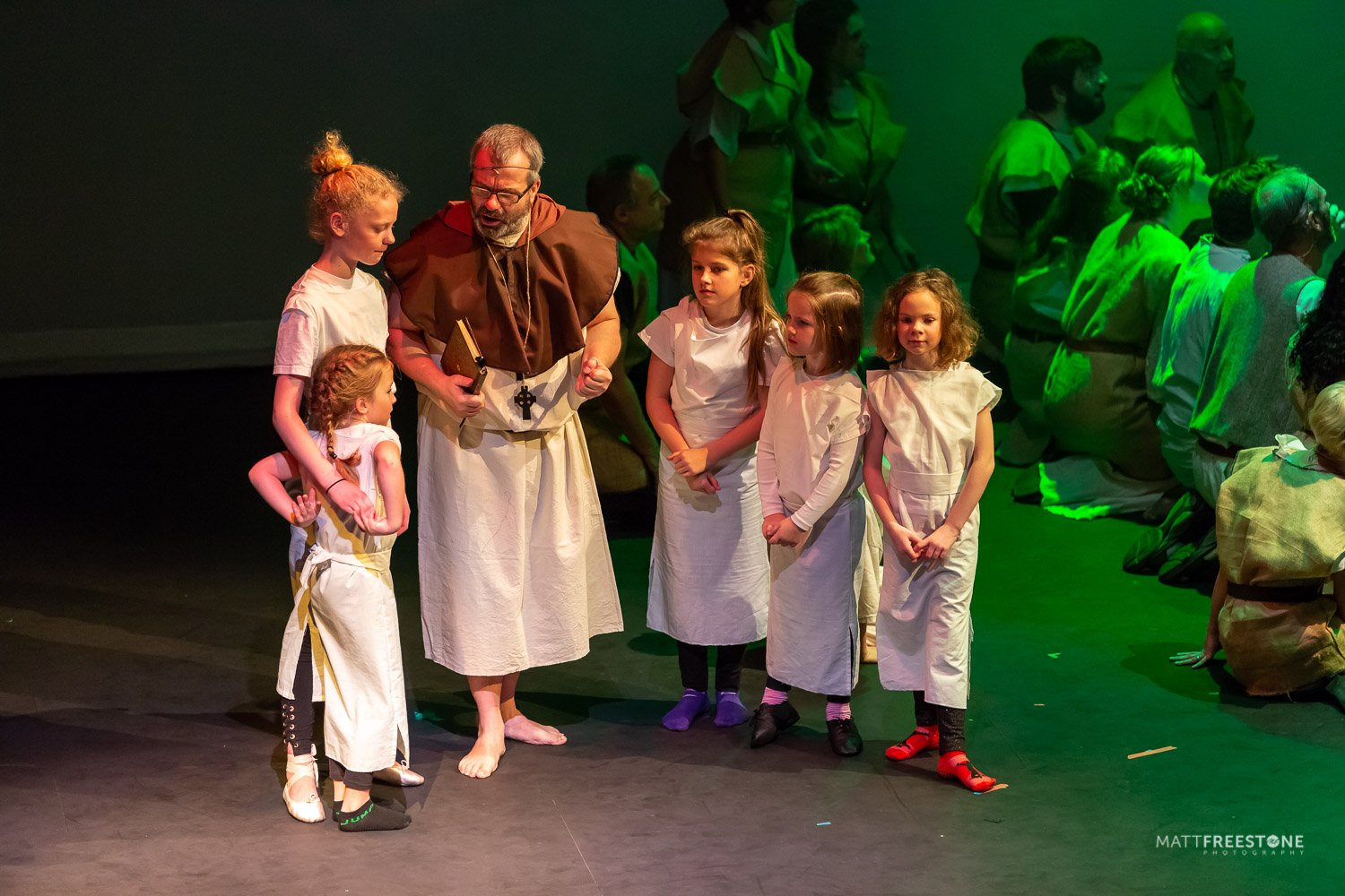 After the Musical opens in the present day with St Patrick’s Day revellers enjoying themselves near a Parade on 17th March, we are then transported back to the 4th/ 5th Century into a British Roman-style community where Patrick grew up with his parents, Calpernius and Conchessa. The story then unfolds using a series of flashbacks described by both narrators and by old Patrick who tells young people about his life: