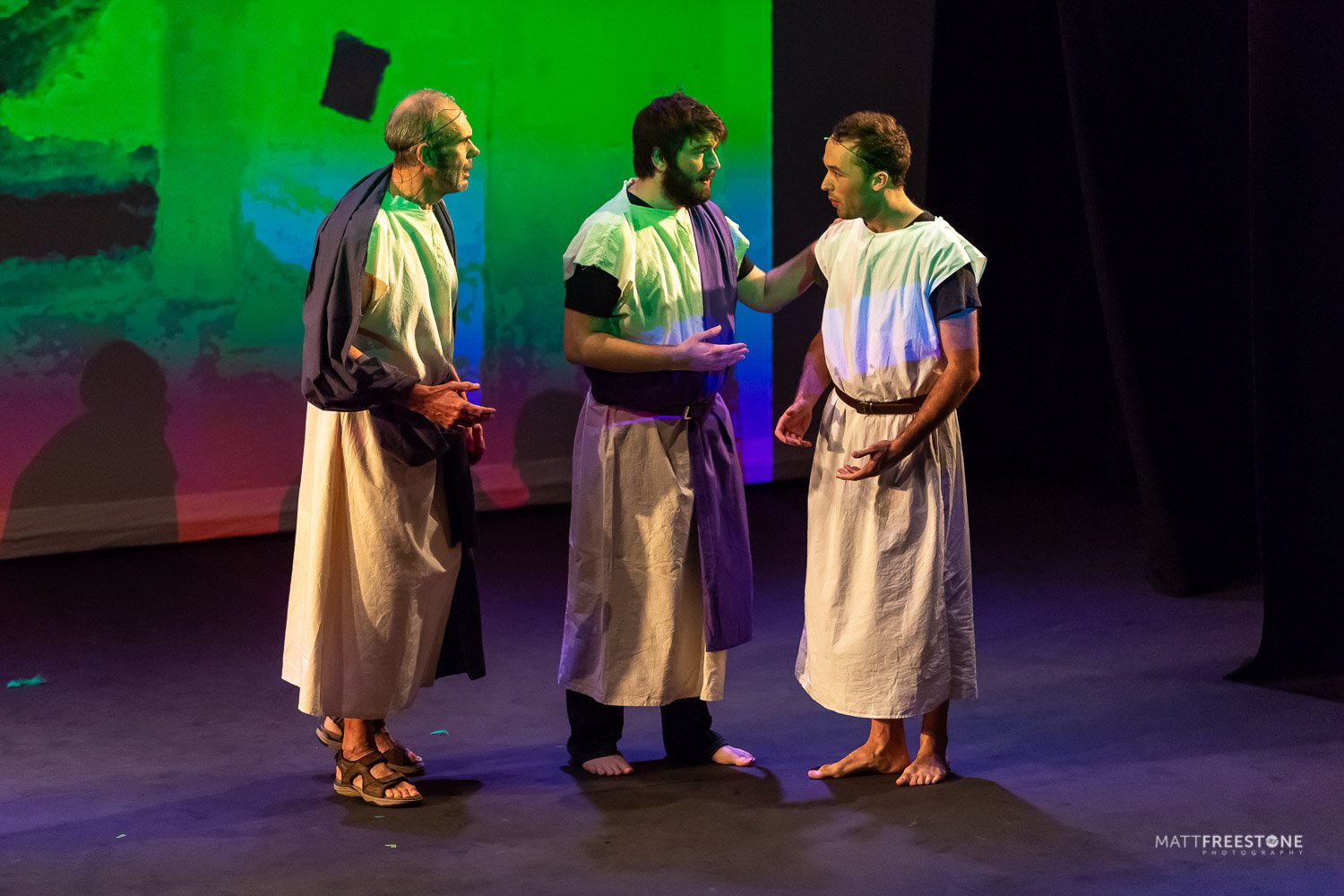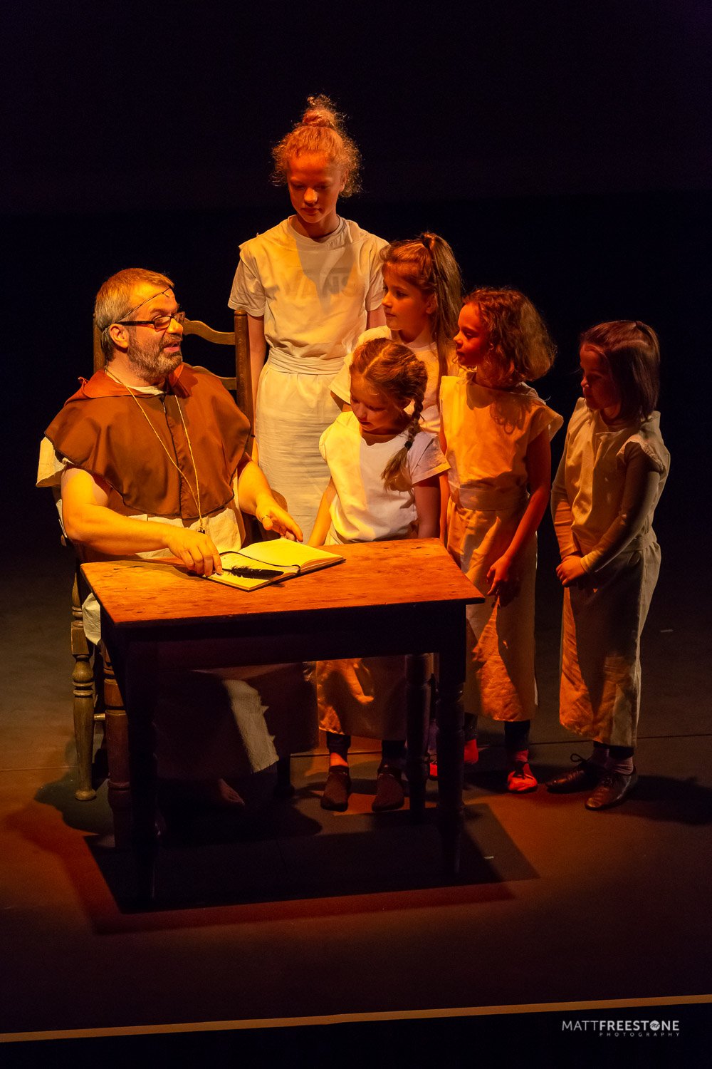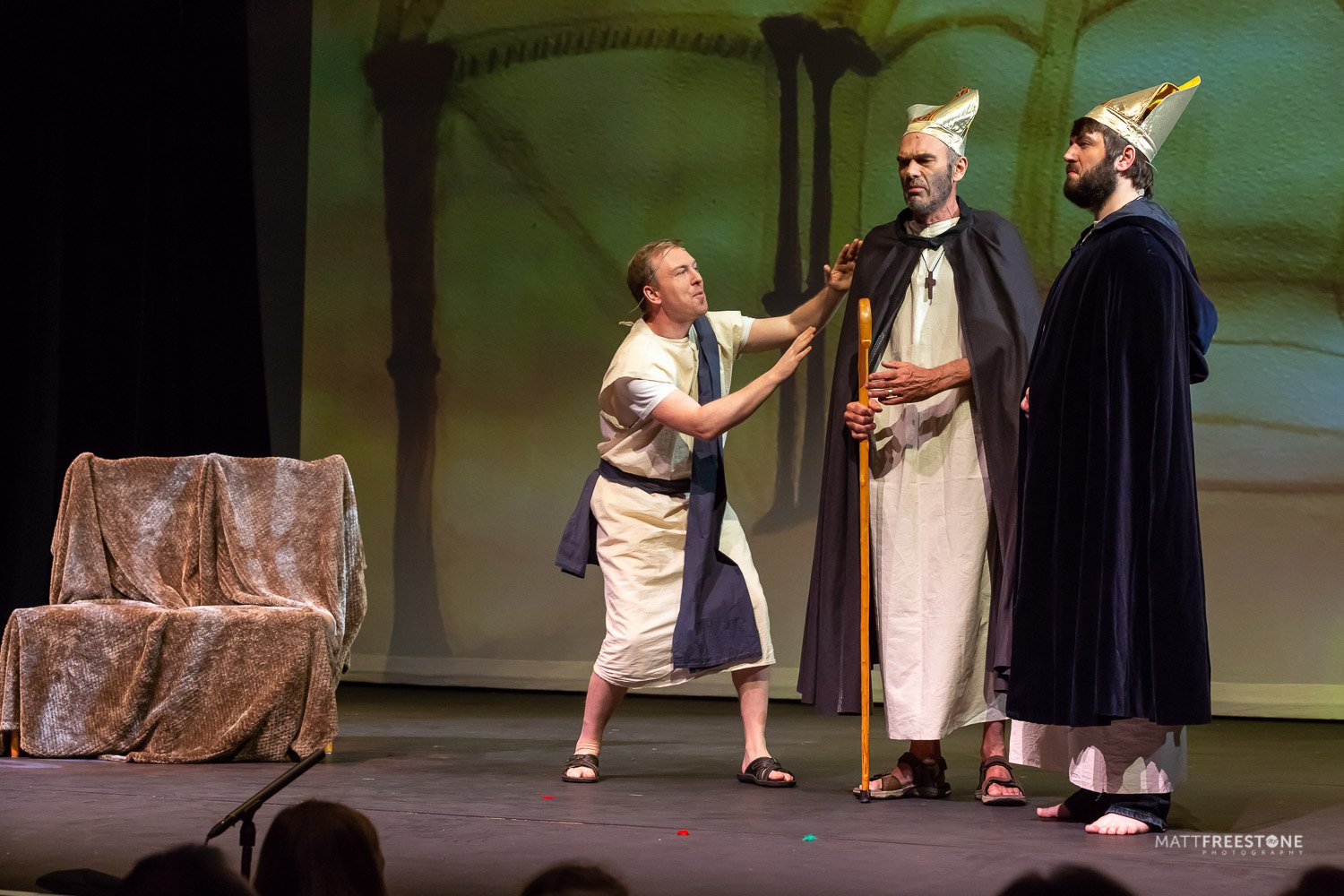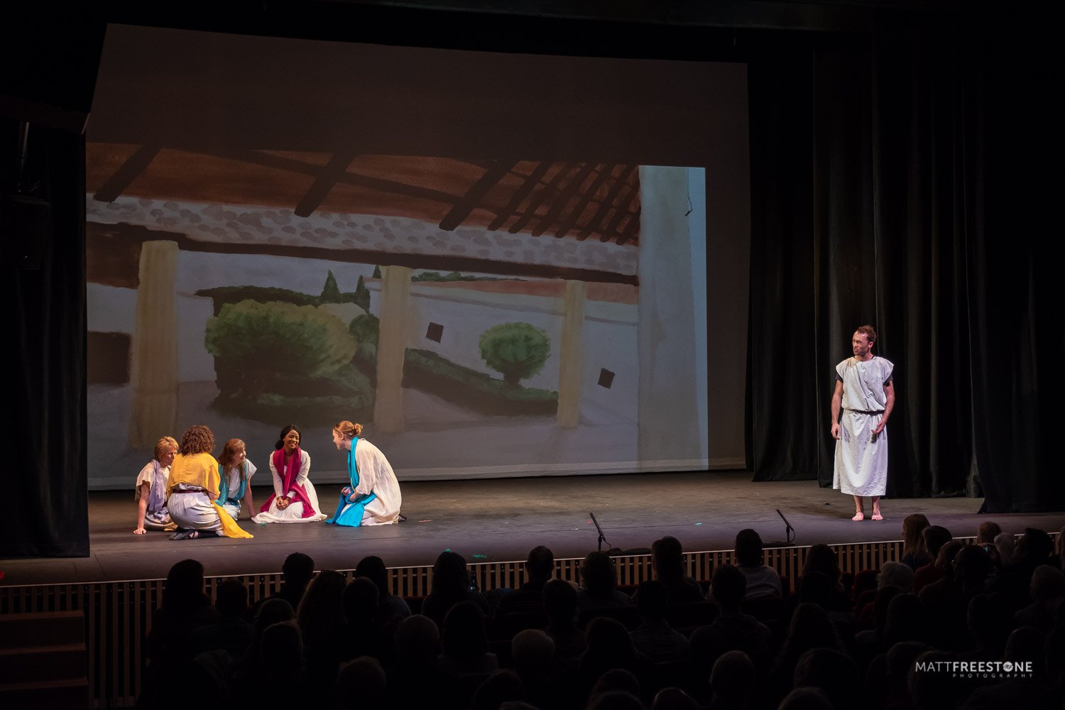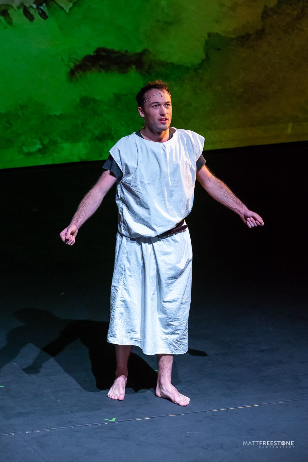 After the Musical opens in the present day with St Patrick’s Day revellers enjoying themselves near a Parade on 17th March, we are then transported back to the 4th/ 5th Century into a British Roman-style community where Patrick grew up with his parents, Calpernius and Conchessa. The story then unfolds using a series of flashbacks described by both narrators and by old Patrick who tells young people about his life: