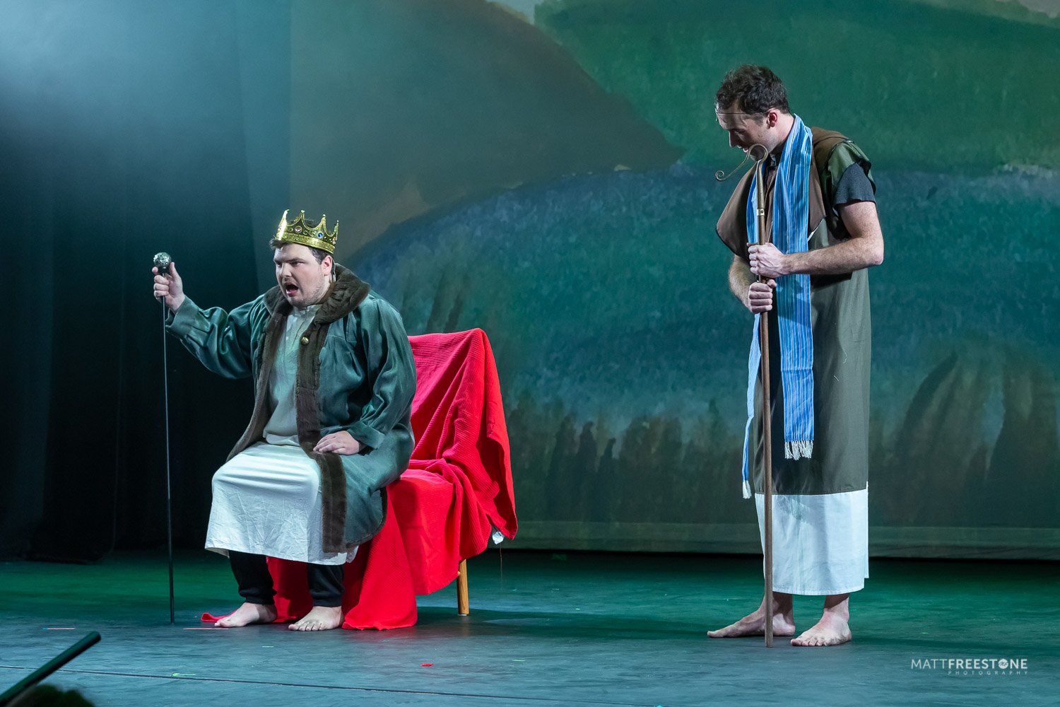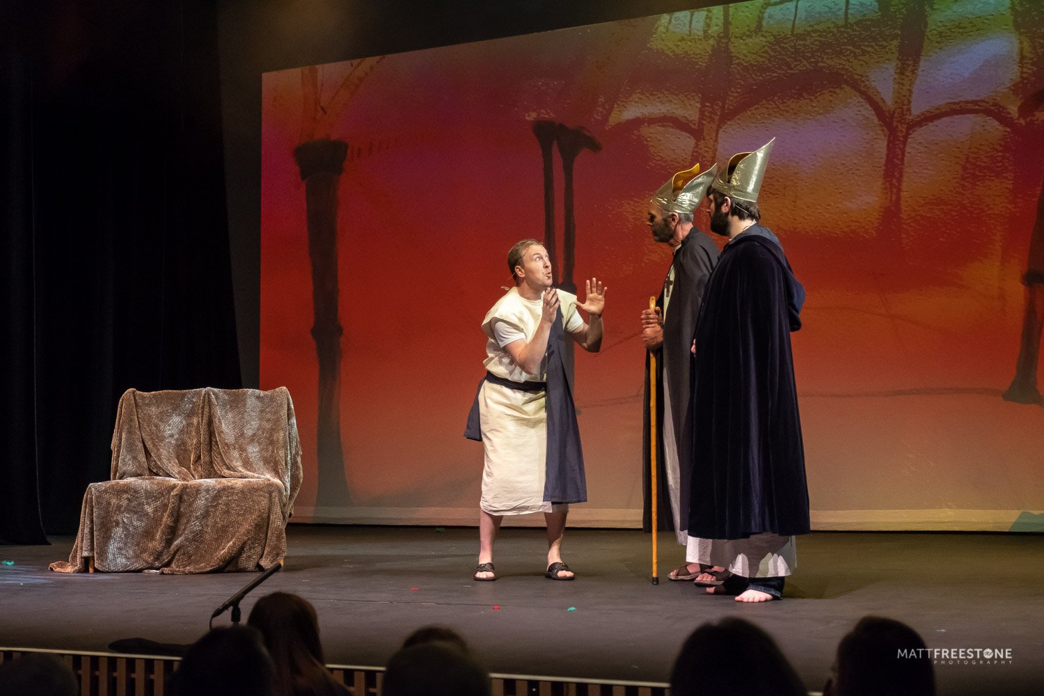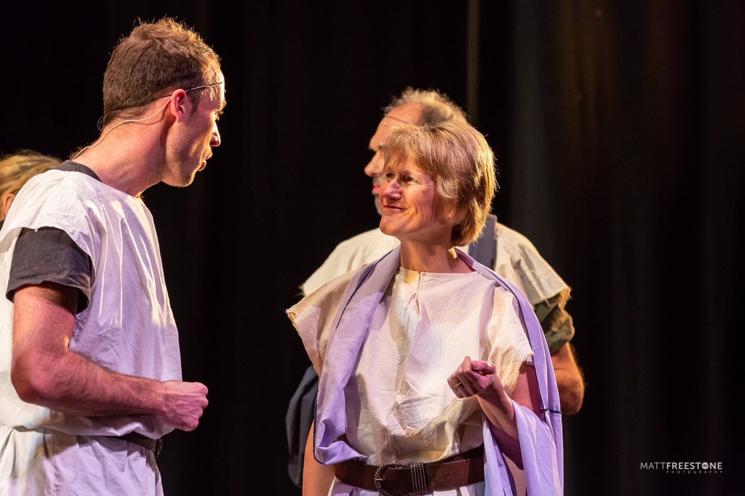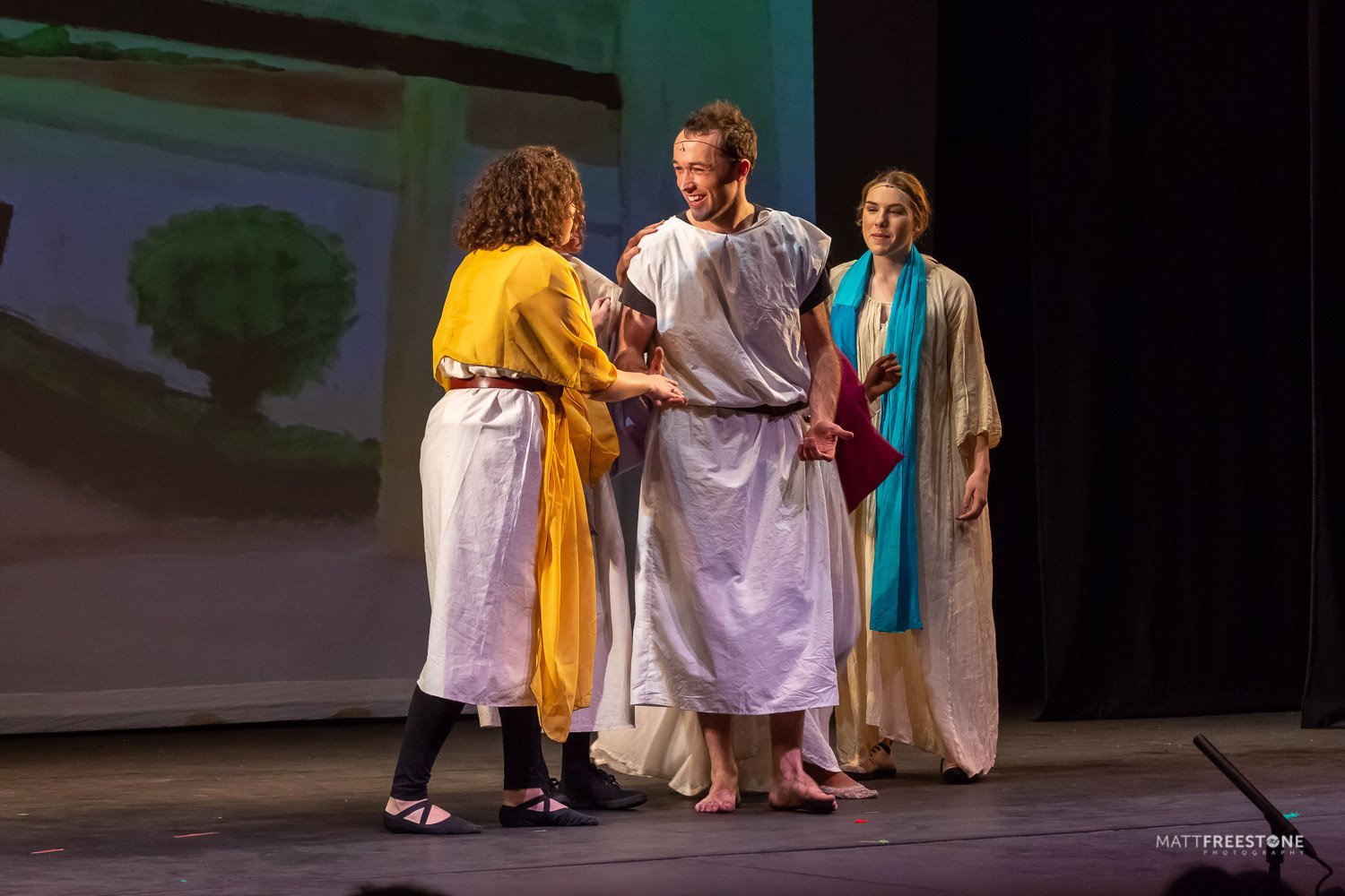 After the Musical opens in the present day with St Patrick’s Day revellers enjoying themselves near a Parade on 17th March, we are then transported back to the 4th/ 5th Century into a British Roman-style community where Patrick grew up with his parents, Calpernius and Conchessa. The story then unfolds using a series of flashbacks described by both narrators and by old Patrick who tells young people about his life: