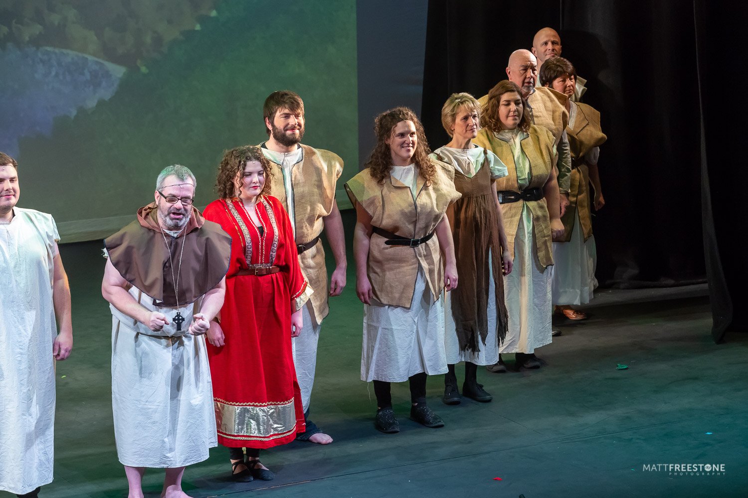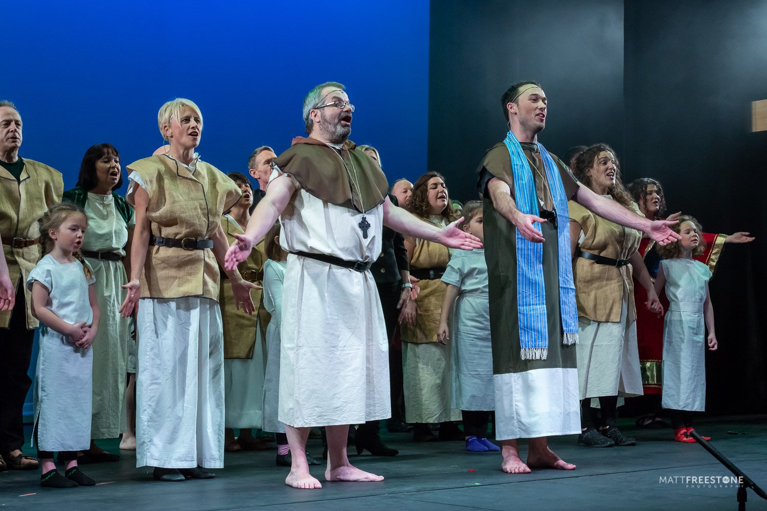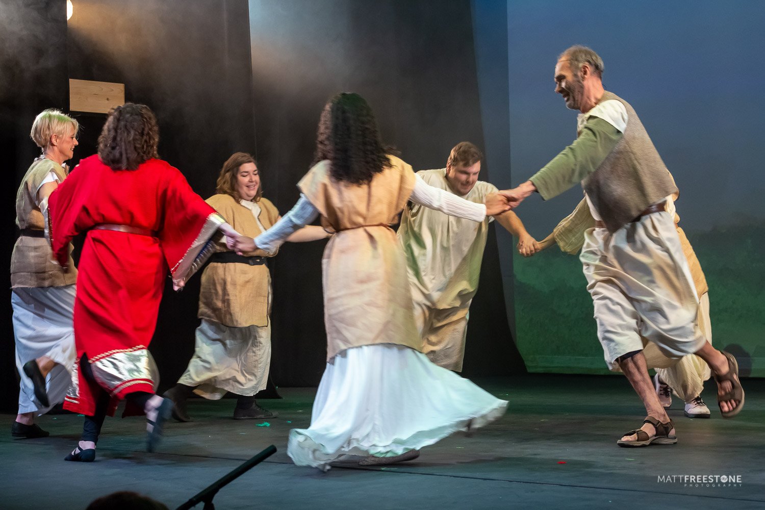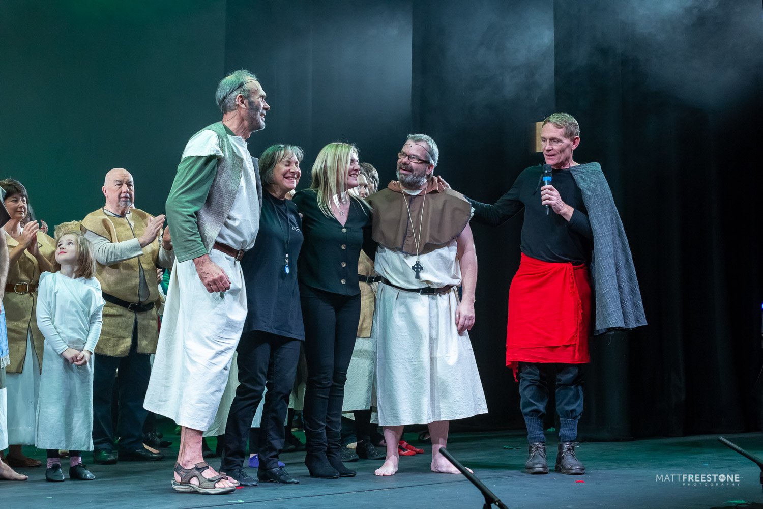 On his return to Ireland he encounters Dichu, a high king in County Down who becomes the first convert. Quickly others see the freedom that Jesus brings through forgiveness and grace, and very soon Patrick establishes numbers of churches across the country in the Judeo-Christian tradition. [Note: within a century, subsequent converts like Brendan, Aidan and Bridgit then spread the Gospel to Scotland, Wales, Northern England and even to Nova Scotia! Ireland really did become the land of Saints and Scholars.] The Musical ends with a declaration by 5th century folk and also by the modern-day characters who have attended the Parade. The attitude of the people has changed. They no longer want to live just for themselves, but for Christ and for others.